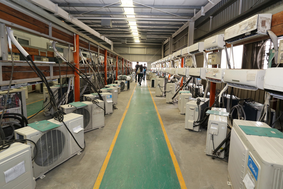 現(xiàn)在的空調(diào)生產(chǎn)線,出現(xiàn)的已不再是擁擠忙碌得跟陀螺似的產(chǎn)業(yè)工人。因?yàn)椴簧俚?span lang="EN-US">“機(jī)器手”、“機(jī)器人”的出現(xiàn),勞動(dòng)密集型的家電制造工廠被賦予了全新的“科技感”和“智能化”的色彩。在空調(diào)室內(nèi)、外機(jī)總裝線體的末端,裝箱、打包等繁重環(huán)節(jié),早已被機(jī)器人所取代。當(dāng)成品從生產(chǎn)線上完成之后,也是通過(guò)機(jī)器手直接搬運(yùn)到流轉(zhuǎn)板上。